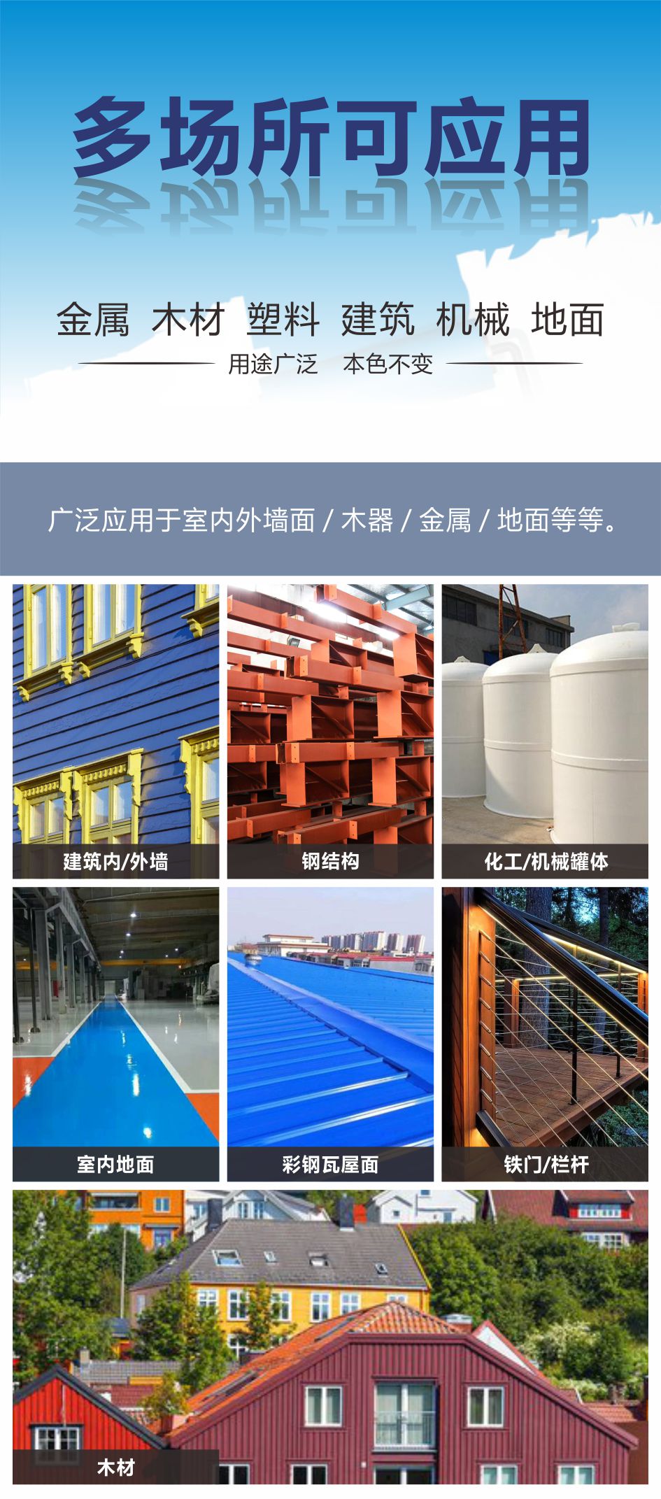 適用于金屬屋面及鋼結構、橋梁、木材、建筑表面、船舶、護欄、鐵門、鐵板等表面的防銹罩面保護和翻新。